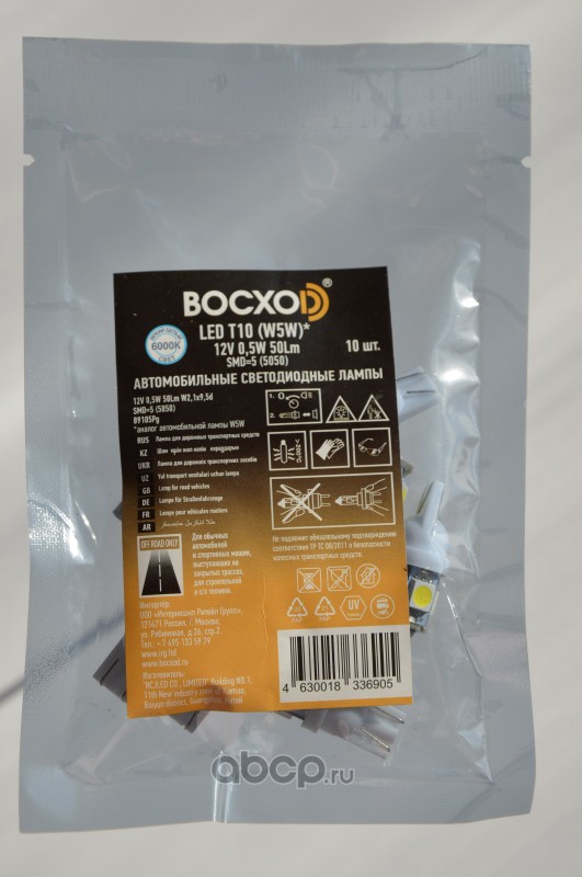 | BOCXOD | 89105PG | Лампа светодиодная ВОСХОD T10 W2.1x9.5d 12V 0.5W 1 шт. | ||