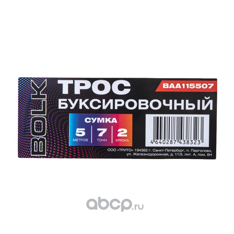 | BOLK | BAA115507 | Трос буксировочный 5 м, 7 т. 2 крюка, сумка | ||