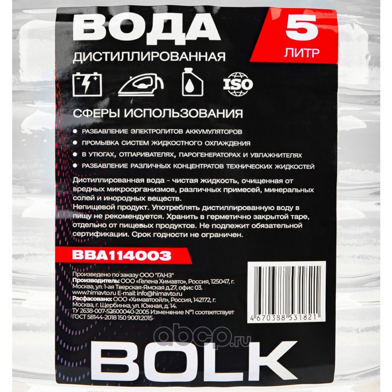 | BOLK | BBA114003 | Вода дистиллированная 5л | ||