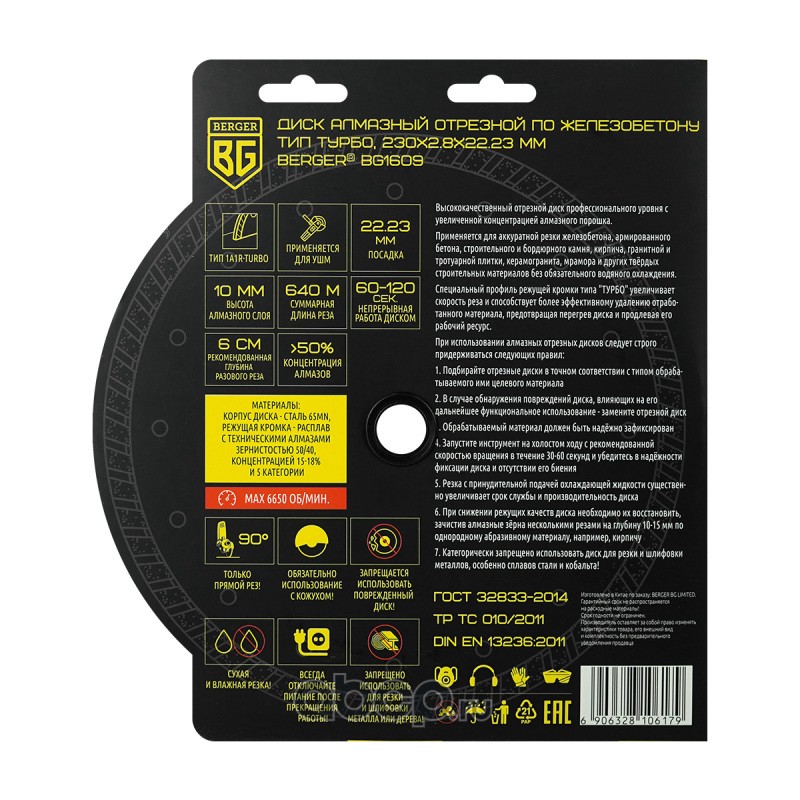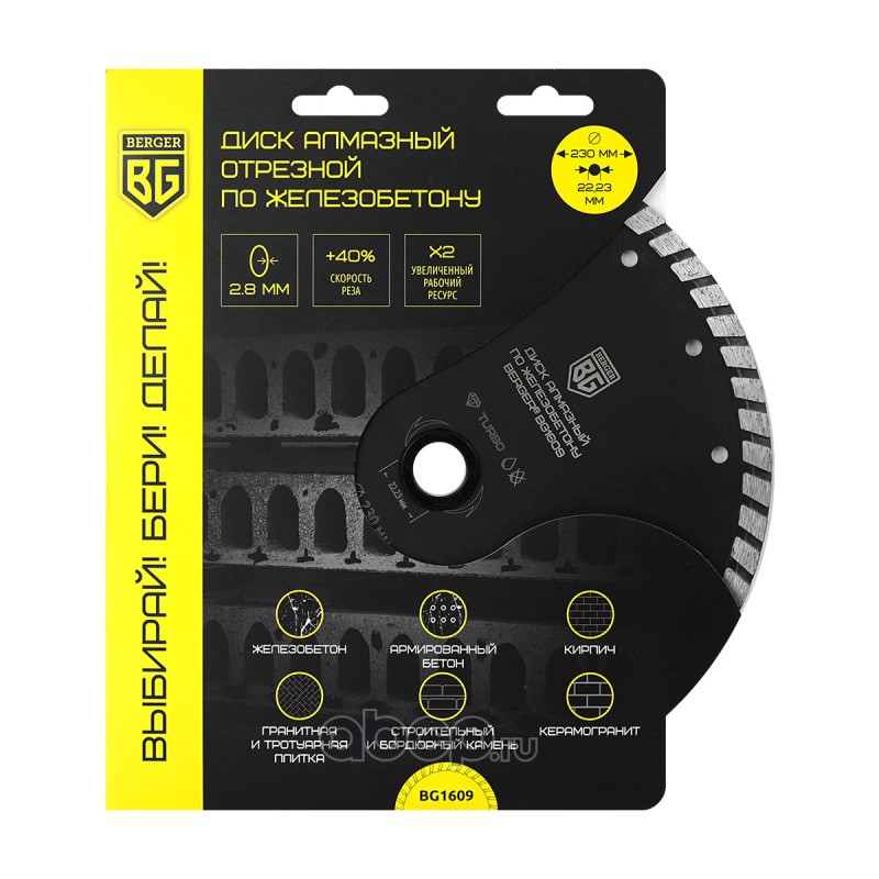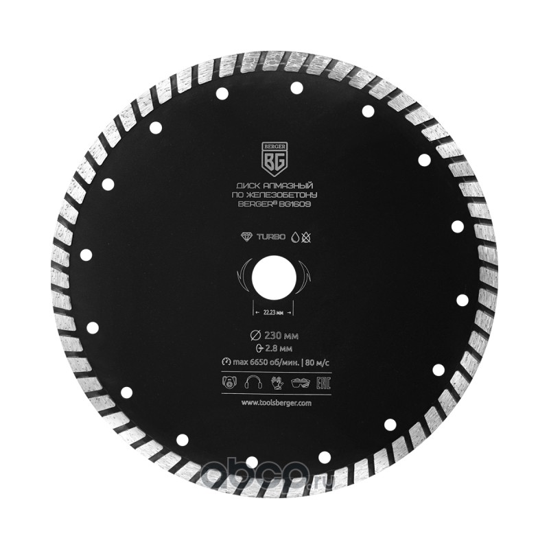| Berger | BG1609 | Диск алмазный отрезной по железобетону (тип турбо, 230x2.8x22.23 мм) BERGER BG1609 | ||