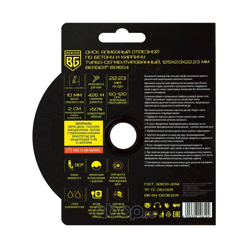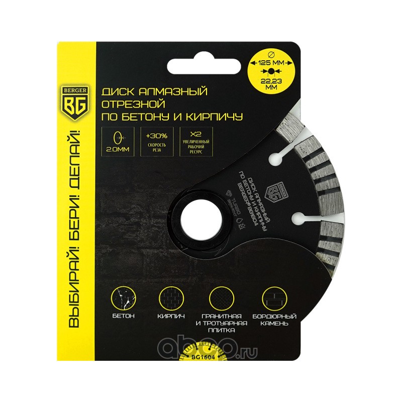 | Berger | BG1604 | Диск алмазный отрезной по бетону и кирпичу (турбо-сегментированный, 125x2.0x22.23 мм) BERGER BG1604 | ||