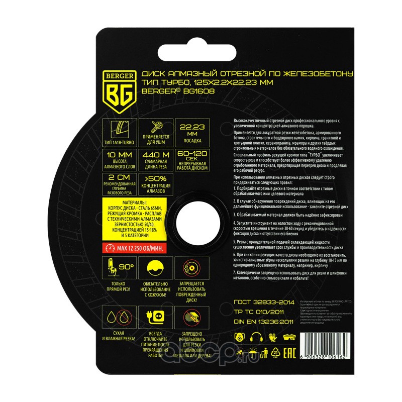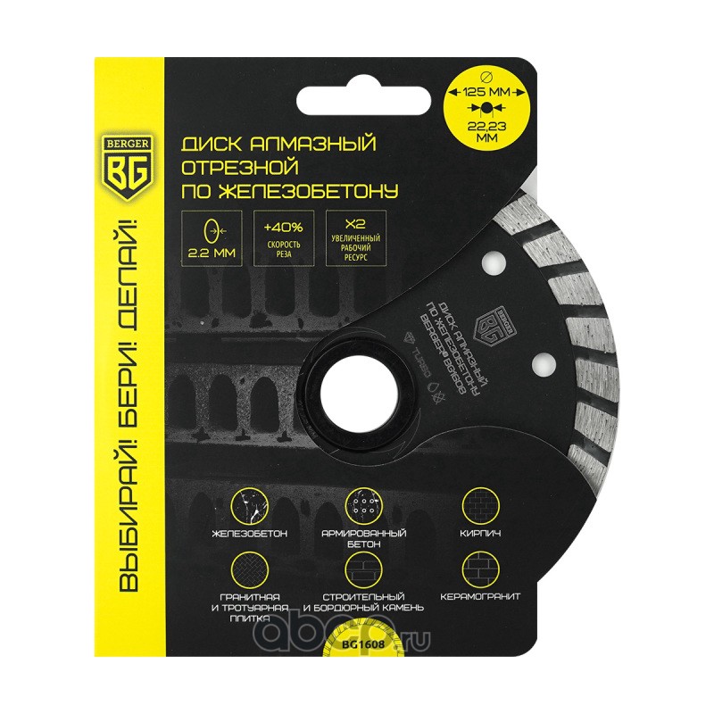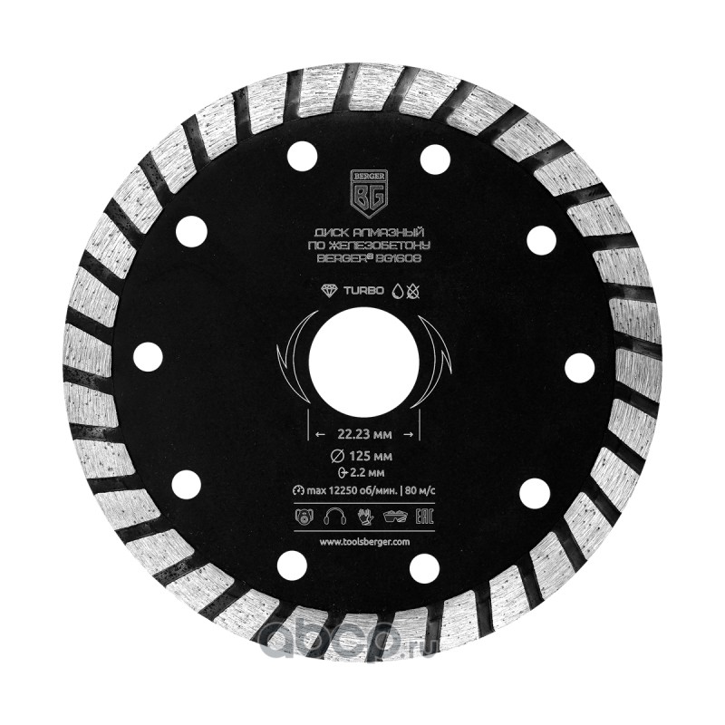 | Berger | BG1608 | Диск алмазный отрезной по железобетону (тип турбо, 125x2.2x22.23 мм) BERGER BG1608 | ||
