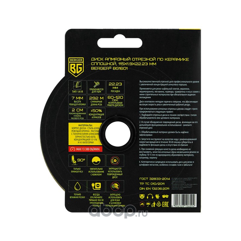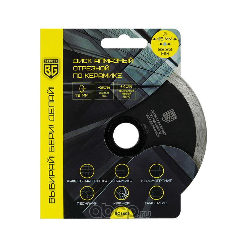 | Berger | BG1601 | Диск алмазный отрезной по керамике (несегментный, 115x1.9x22.23 мм) BERGER BG1601 | ||