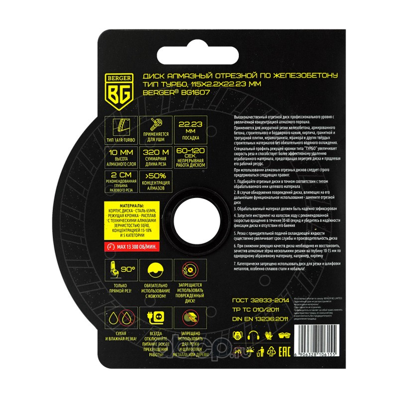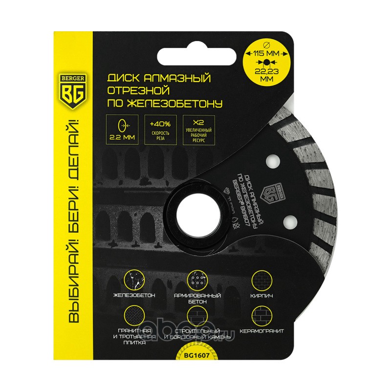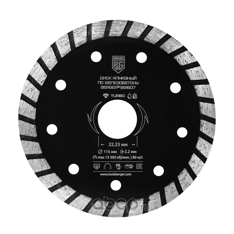 | Berger | BG1607 | Диск алмазный отрезной по железобетону (тип турбо, 115x2.2x22.23 мм) BERGER BG1607 | ||