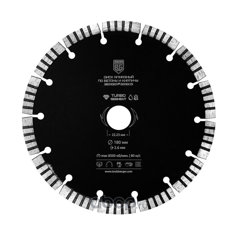 | Berger | BG1605 | Диск алмазный отрезной по бетону и кирпичу (турбо-сегментированный, 180x2.6x22.23 мм) BERGER BG1605 | ||