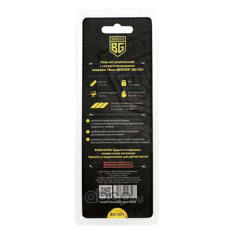 | Berger | BG1351 | Нож металлический с сегментированным лезвием 18мм BERGER BG1351 | ||