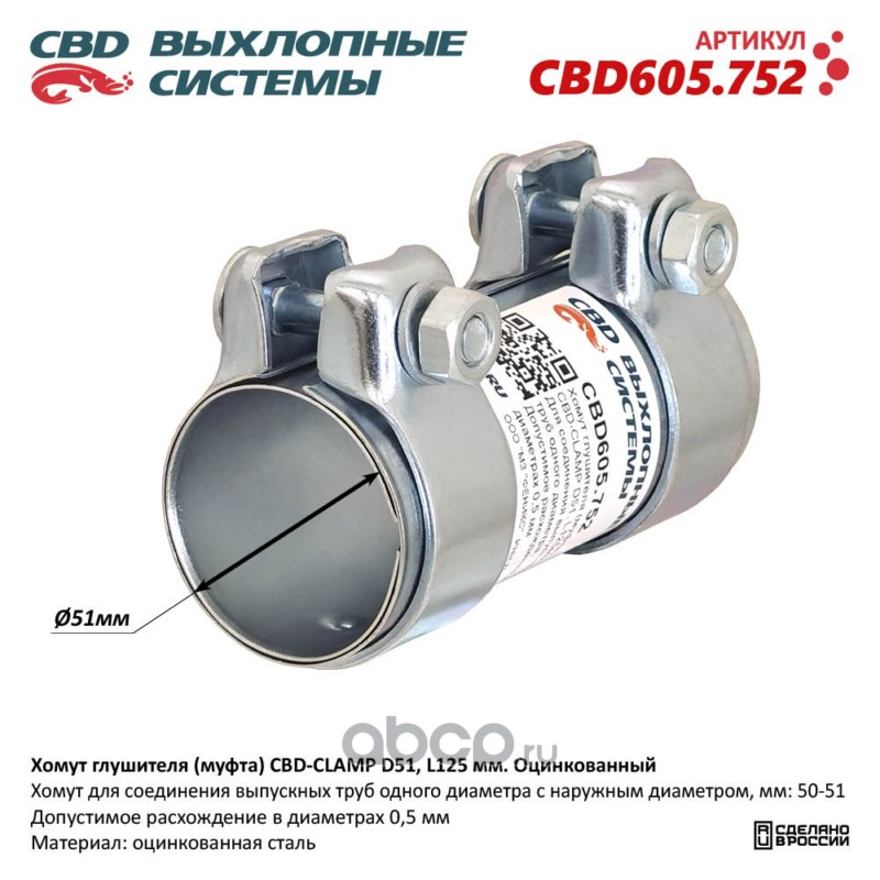 | CBD | CBD605752 | Хомут глушителя (муфта) -CLAMP D51, L125мм. Оцинкованный | ||