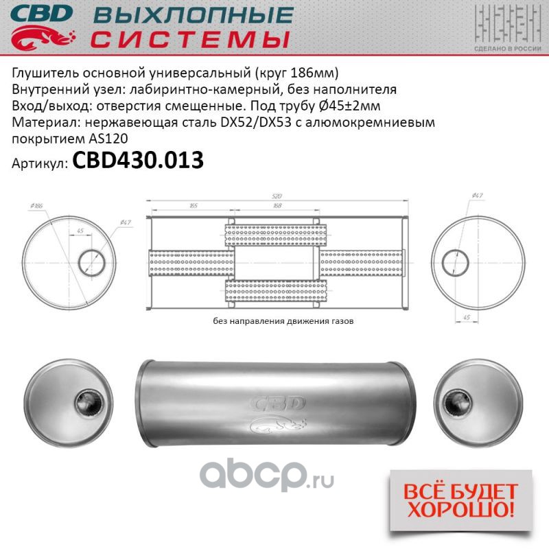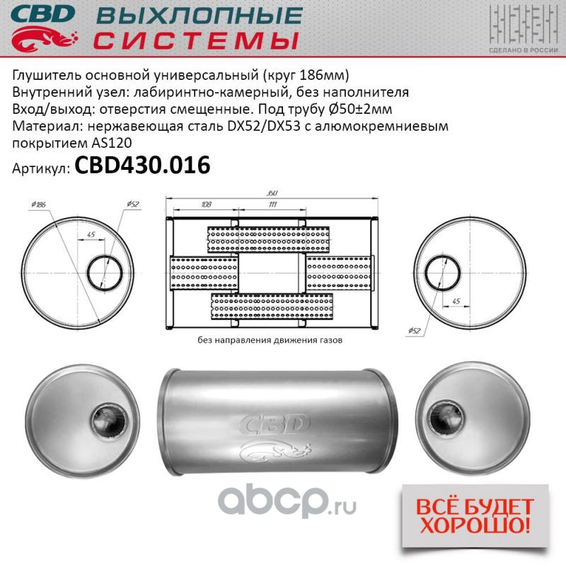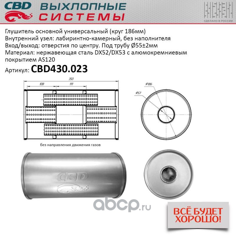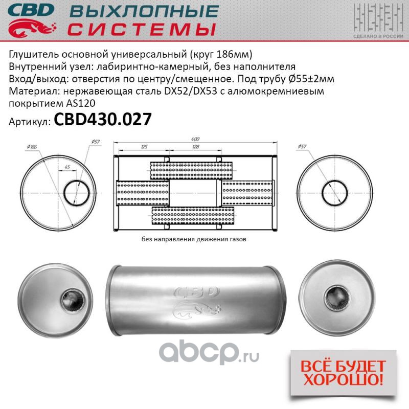 Глушитель основной универсальный Нерж сталь. Круг D186, L400. Отверстия по центру/смещенное, под трубу 55±2мм.