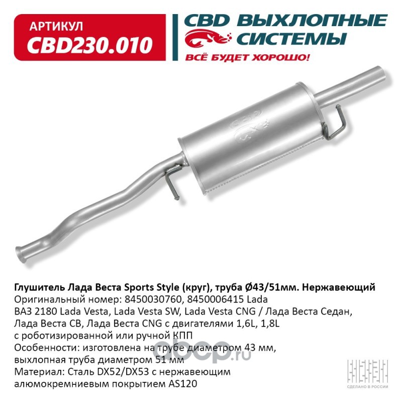 | CBD | CBD230010 | Глушитель Лада Веста Sports Style, труба O43/51мм. Нержавеющий. | ||