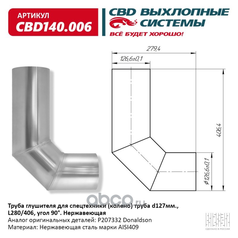 | CBD | CBD140006 | Труба глушителя для спецтехники (колено) труба d127мм., L280/406, угол 90°, аналог P207332. Нержавеющая | ||