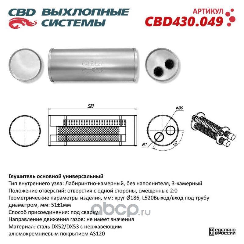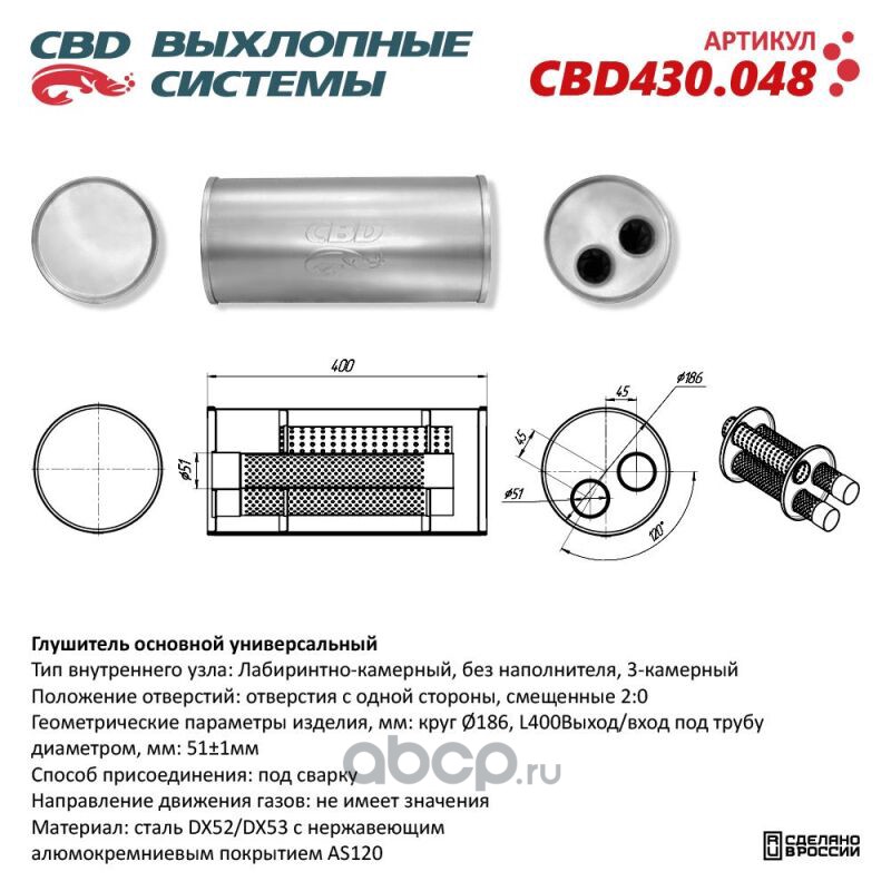 | CBD | CBD430048 | Глушитель. Нержавеющий. Круг Ø186, L400. Отверстия с одной стороны смещенные (2:0) под трубу 51мм. |