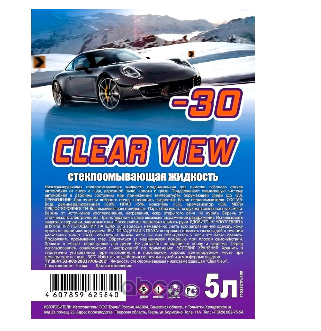 Жидкость стеклоомывателя Clear View зимняя незамерзающая до -30C, 5 литров, упаковка 4 шт.