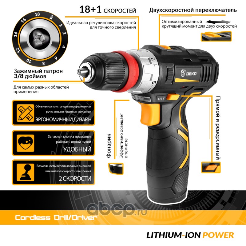 DEKO 0634169 Аккумуляторная дрель-шуруповерт DEKO Banger 12V Li-Ion, 26Нм, 2х1.8 Ач, з/у