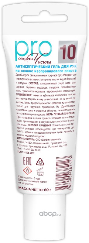 | Delfin Group | 32967 | Антисептик для рук, гель, тюбик 60г. Секреты чистоты PRO () | ||