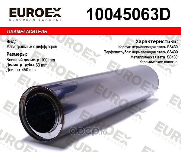 EUROEX | 10045063D | Пламегаситель магистральный 100x450x63 нерж. с диф. (диаметр трубы 63мм, общая длина 450мм диаметр бочонка 100мм) | ||