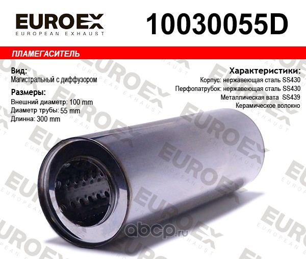 EUROEX | 10030055D | Пламегаситель магистральный с диф. 100x300x55 нерж. (диаметр трубы 55мм, общая длина 300мм диаметр бочонка 100мм) |