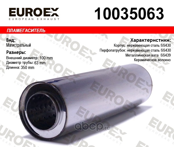 EUROEX | 10035063 | Пламегаситель магистральный 100x350x55 нерж. (диаметр трубы 63мм, общая длина 350мм диаметр бочонка 100мм) | ||