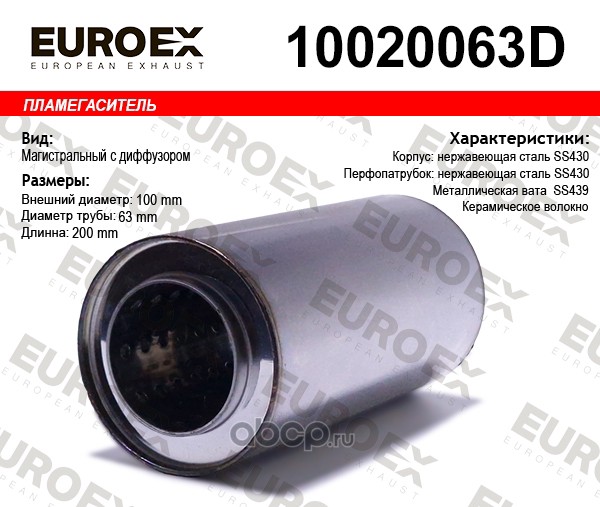 | EUROEX | 10020063D | Пламегаситель магистральный с диф. 100x200x63 нерж. (диаметр трубы 63мм, общая длина 200мм диаметр бочонка 100мм) | ||