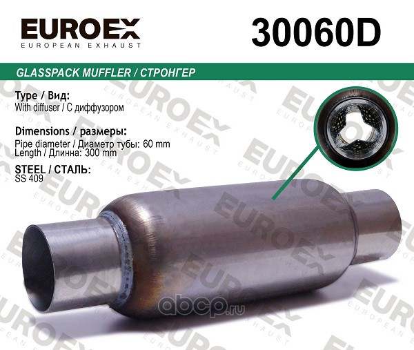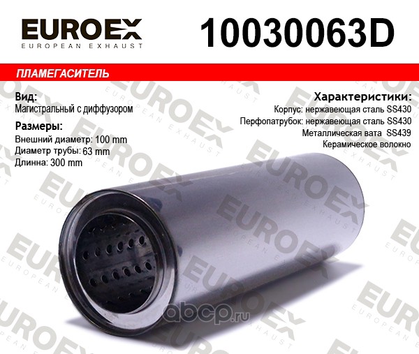 | EUROEX | 10030063D | Пламегаситель магистральный с диф. 100x300x63 нерж. (диаметр трубы 63мм, общая длина 300мм диаметр бочонка 100мм) | ||