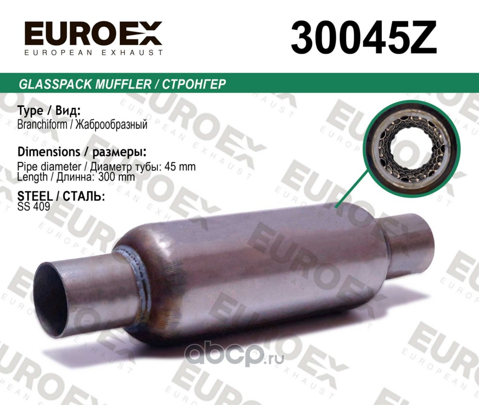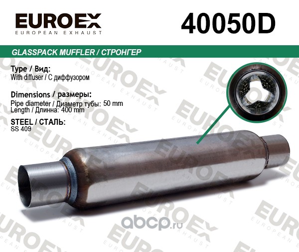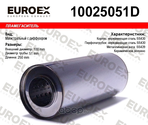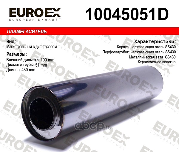 | EUROEX | 10045051D | Пламегаситель магистральный 100x450x51 нерж. с диф. (диаметр трубы 51мм, общая длина 450мм диаметр бочонка 100мм) | ||