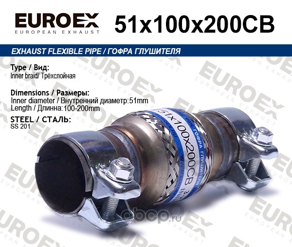 | EUROEX | 51X100X200CB | Гофра глушителя 51x100x200 3-х слойная с хомутами | ||