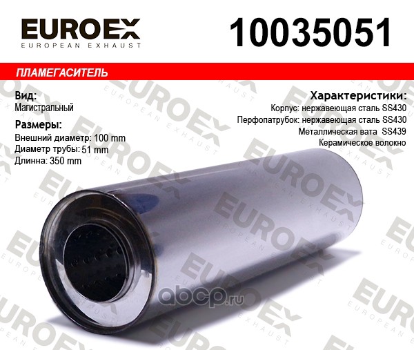 | EUROEX | 10035051 | Пламегаситель магистральный 100x350x51 нерж. (диаметр трубы 51мм, общая длина 350мм диаметр бочонка 100мм) | ||