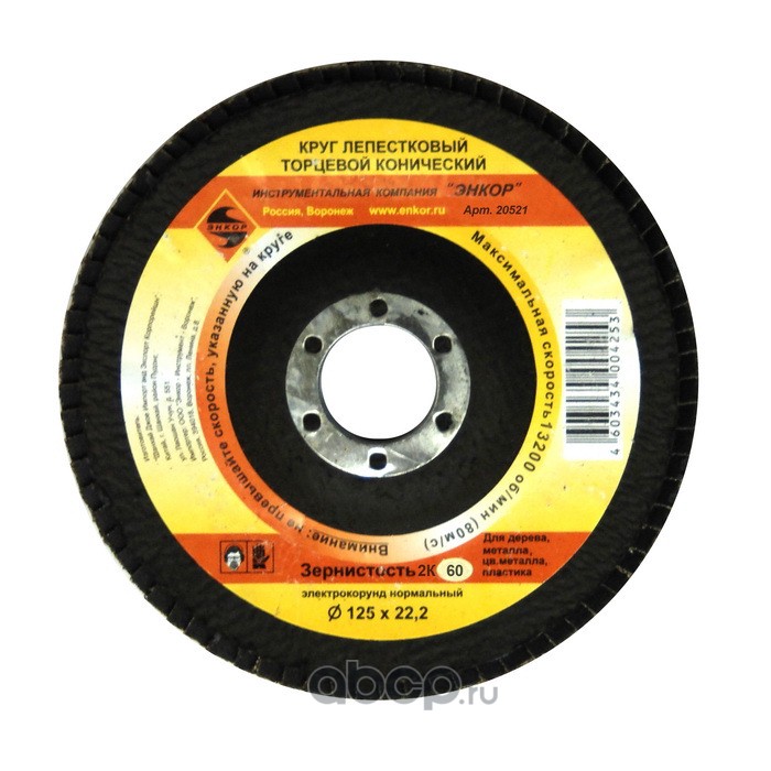 | Enkor | 20521 | Круг лепест торц ф125х22,2 К60 конич см.55406 | ||