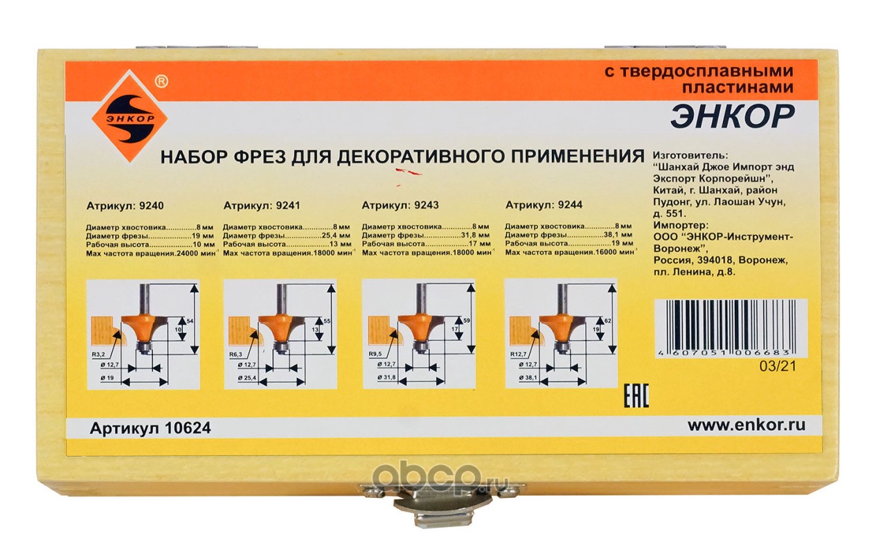 | Enkor | 10624 | Набор фрез д/декоратив прим 4шт хв 8мм | ||