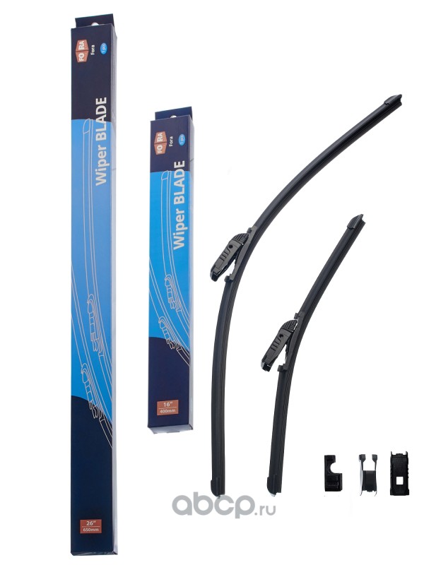 Щетки стеклоочистителя (комплект 400 мм. и 400 мм.), бескаркасные, универсальный адаптер.