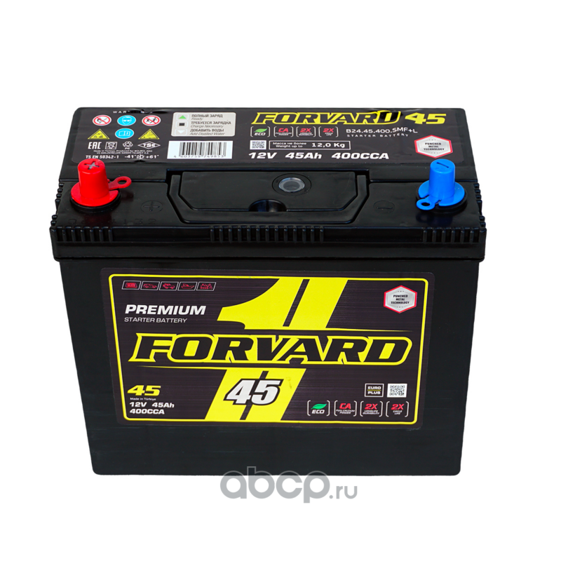 | FORVARD | FB2445400SMFL | Батарея аккумуляторная ASIA 12В 45А/ч 400CCA прямая полярность тонкие вынос. (Азия) клеммы | ||
