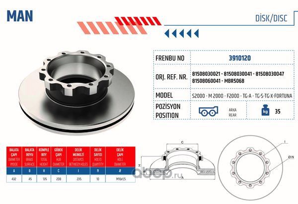 | FRENBU | 3910120 | Диск тормозной задний MAN TGA-FORTUNA OEM: 81508030041. Турция | ||