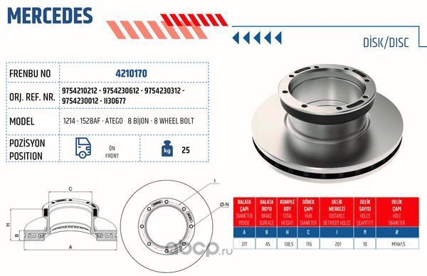 | FRENBU | 4210170 | Тормозной диск Mercedes-Bens ATEGO 1214-1528 AF (задняя ось).Турция | ||