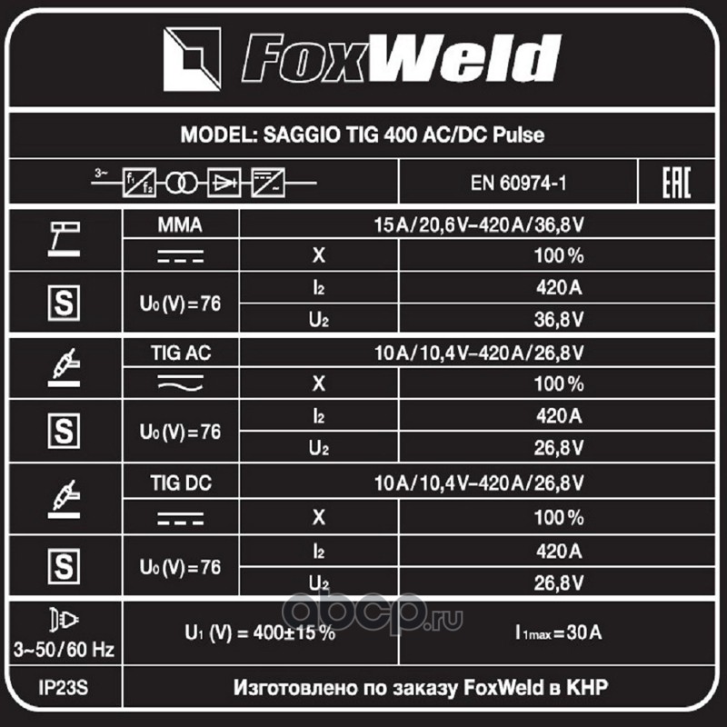 | FoxWeld | 7587 | Аппарат аргонодуговой сварки SAGGIO TIG 400 AC/DC Pulse | ||