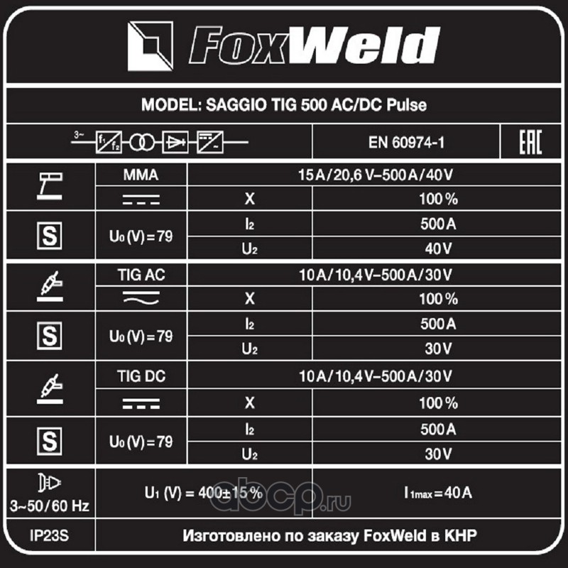 | FoxWeld | 7588 | Аппарат аргонодуговой сварки SAGGIO TIG 500 AC/DC Pulse | ||