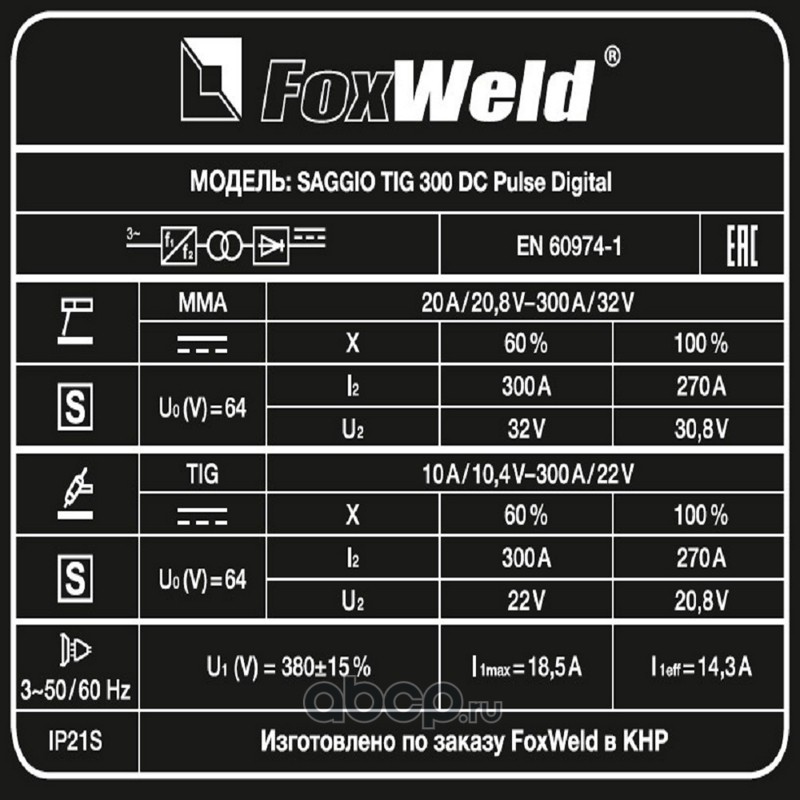| FoxWeld | 6134 | Аппарат аргонодуговой сварки SAGGIO TIG 300 DC Pulse Digital | ||