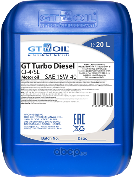 | GT OIL | 4631111116364 | Масло моторное минеральное GT OIL GT Turbo Diesel CI-4 15W-40 20 л. | ||