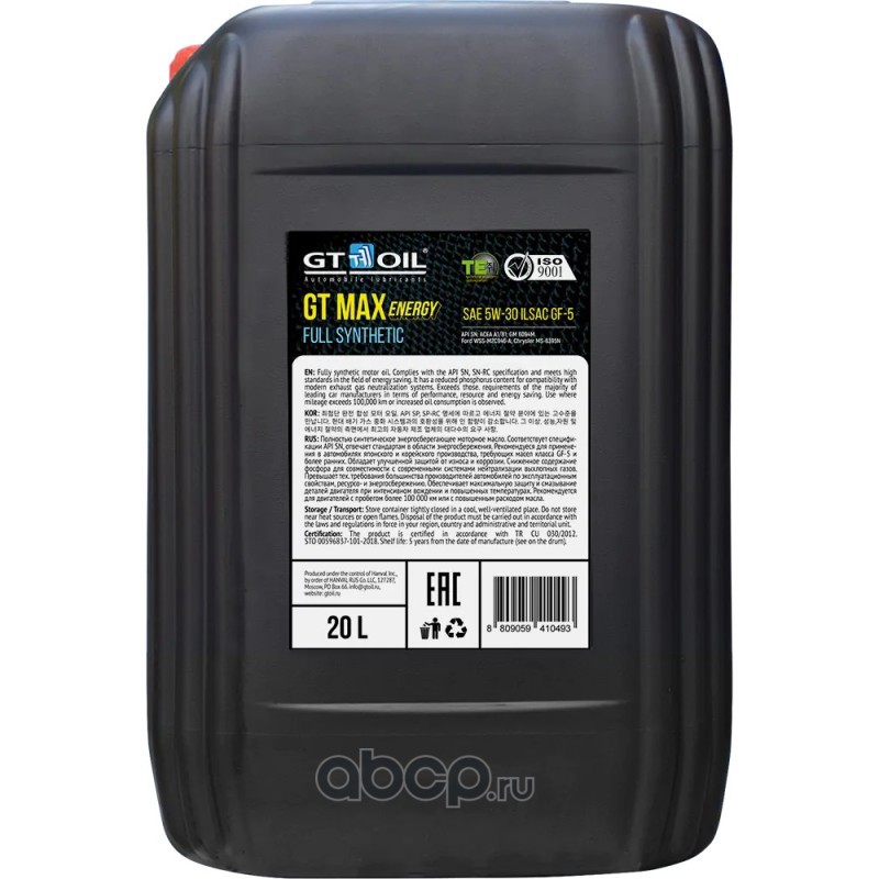 | GT OIL | 8809059410493 | Масло моторное синтетика GT OIL GT MAX Energy 5W-30 20 л. | ||