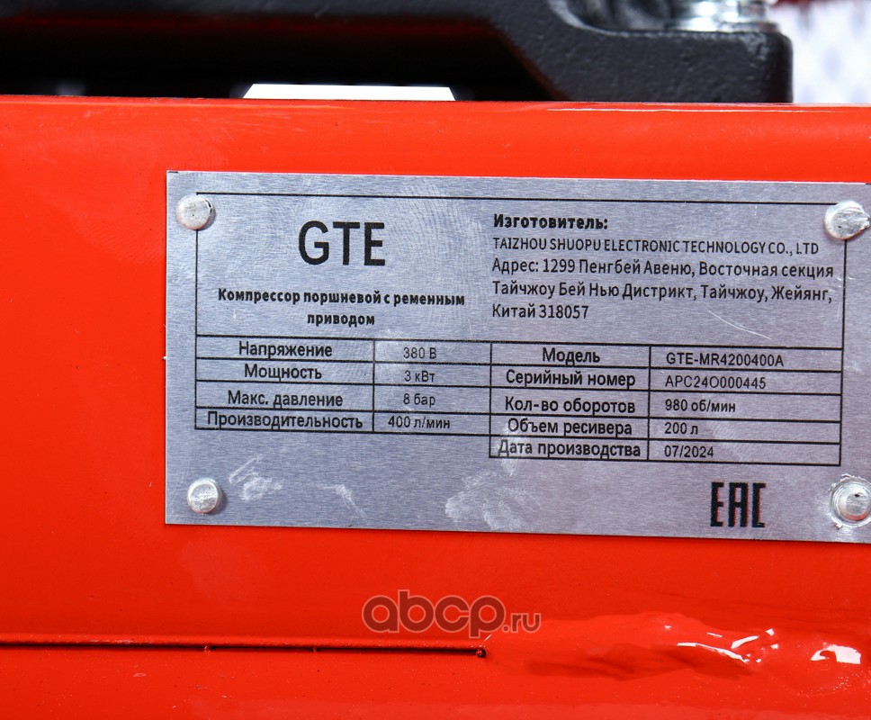 Компрессор поршневой с ременным приводом 380В, ресив. 200л, 400л/мин.