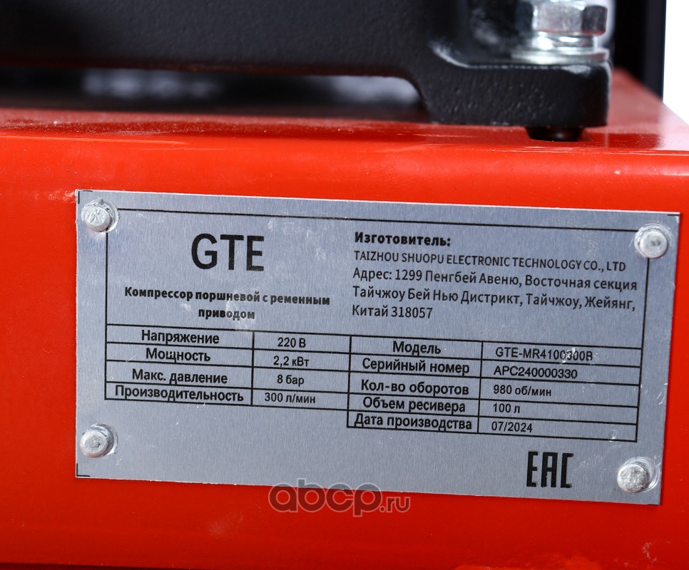 Компрессор поршневой с ременным приводом 220В, ресив. 100л, 300л/мин.