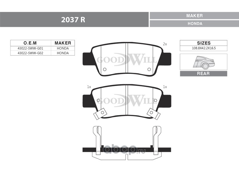 | Goodwill | 2037R | Колодки тормозные дисковые задние, комплект | ||