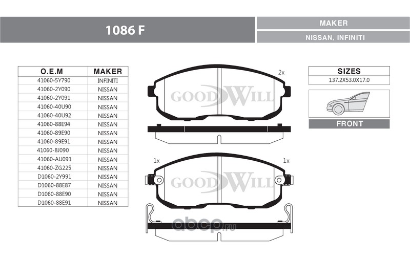 | Goodwill | 1086F | Колодки тормозные дисковые передние, комплект | ||