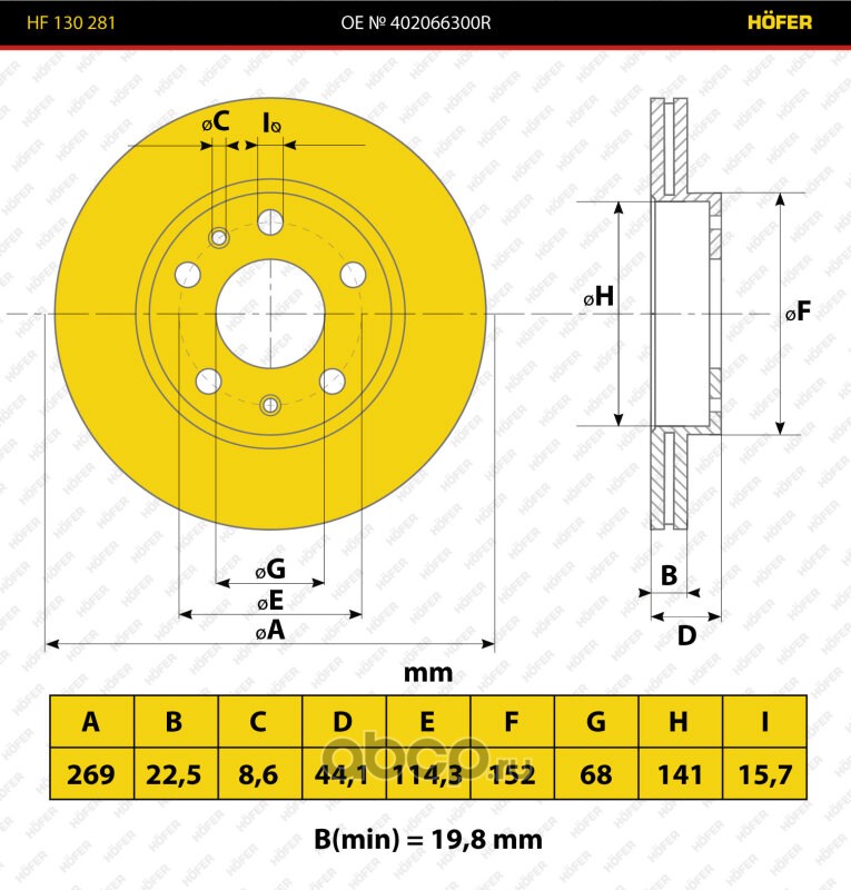 | HOFER | HF130281 | Диск переднего тормоза Renault Duster (10-) вент., 269x23мм | ||