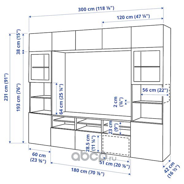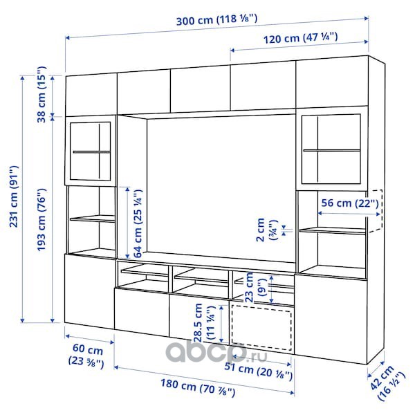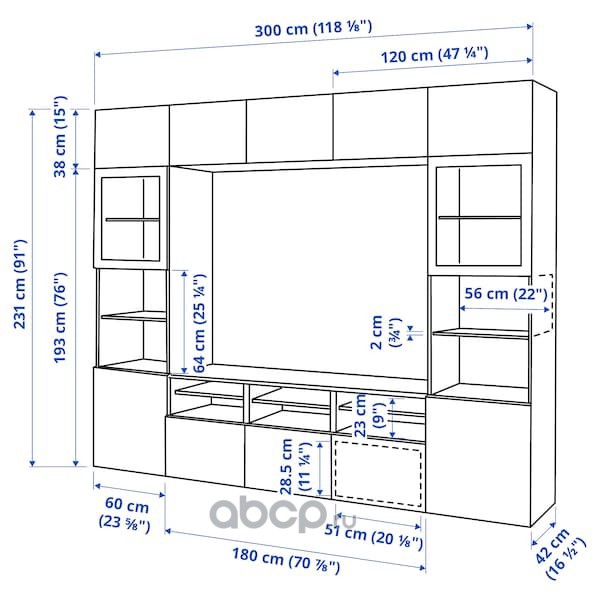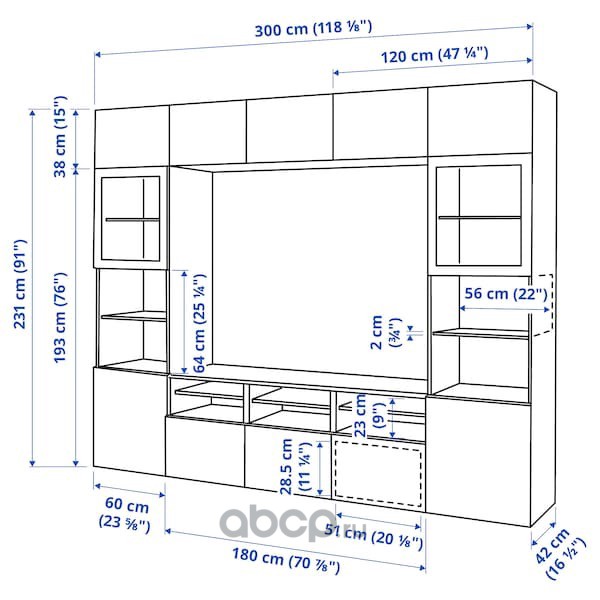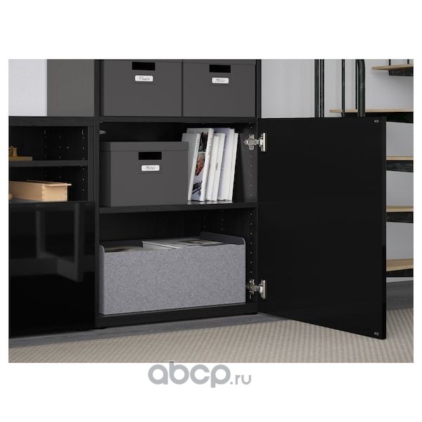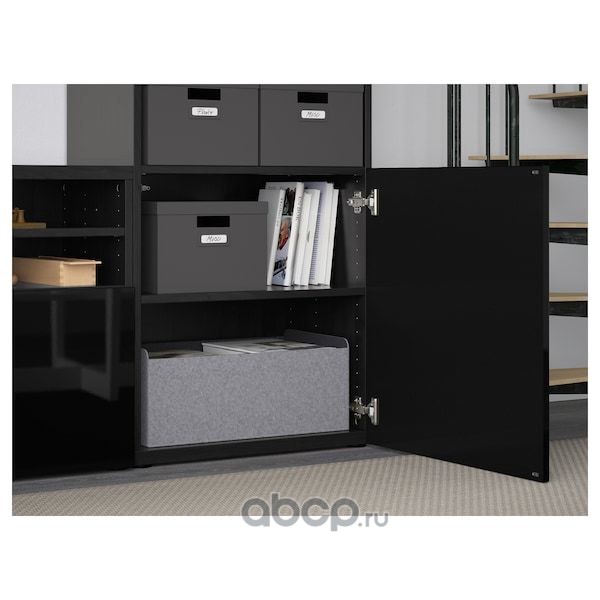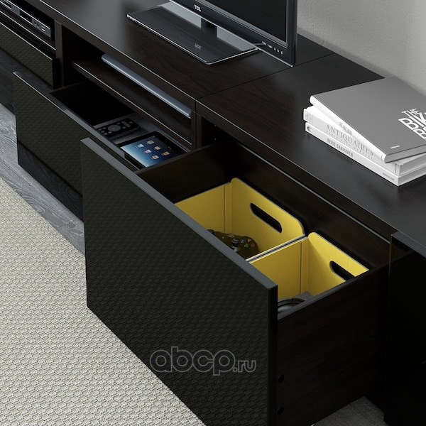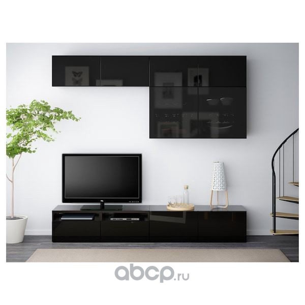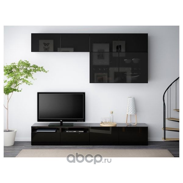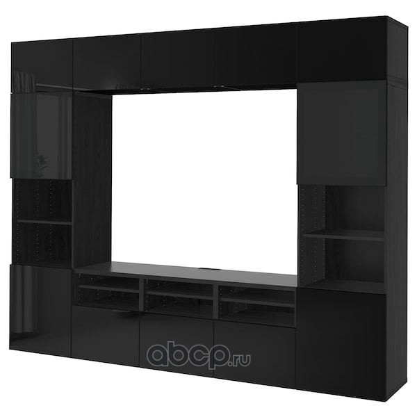 BESTÅ БЕСТО Шкаф для ТВ, комбин/стеклян дверцы, черно-коричневый/Сельсвикен глянцевый/черный дымчатое стекло 300X42X231см
