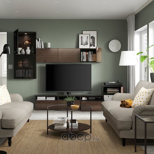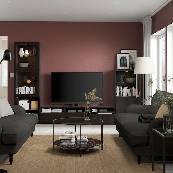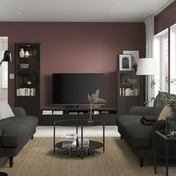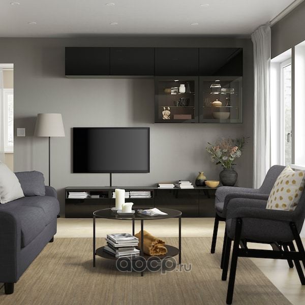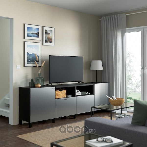 BESTÅ БЕСТО Шкаф для ТВ, комбин/стеклян дверцы, черно-коричневый/Сельсвикен глянцевый/коричневый дымчат стекло 300X42X211см