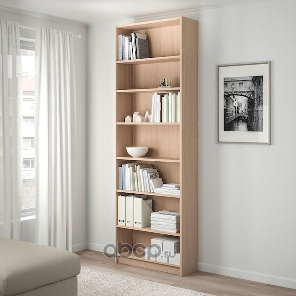 BILLY БИЛЛИ Стеллаж с верхней полкой, дубовый шпон, беленый 80x28x237 см/кг