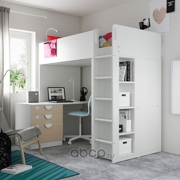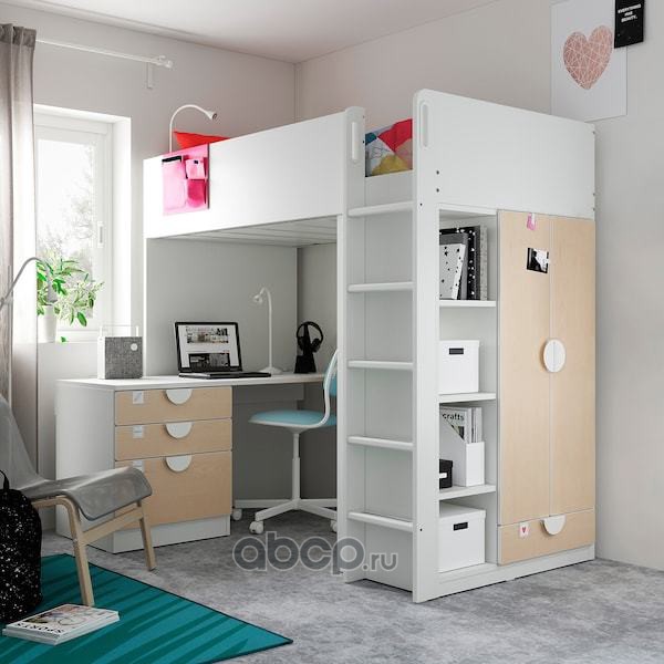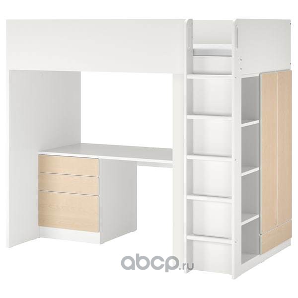 SMÅSTAD СМОСТАД Кровать-чердак, белый береза/с письменным столом с 4 ящиками 90x200см
