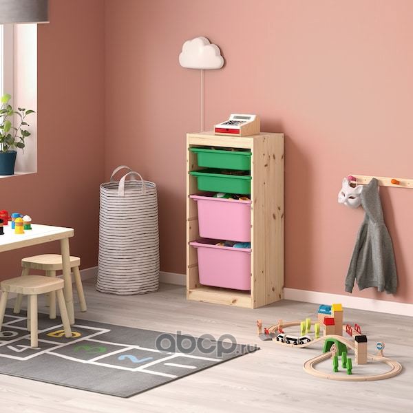 TROFAST ТРУФАСТ Комбинация д/хранения+контейнеры, светлая беленая сосна зеленый/розовый 44X30X91см