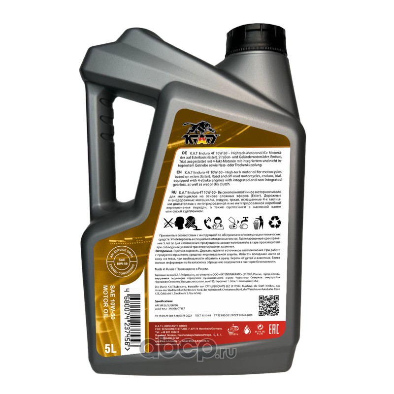 | KAT-Lubricants | ER100033 | Моторное масло для мототехники K.A.T Enduro 4T 10W-50 5л синтетическое | ||