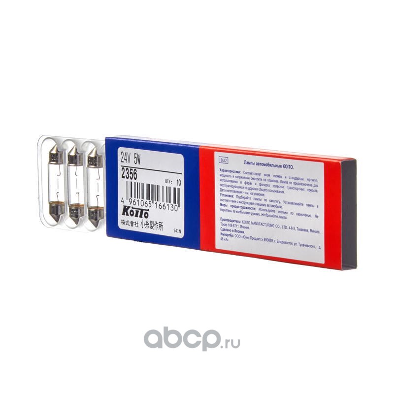 | KOITO | 2356 | Лампа накаливания KOITO C5W SV8.5 24V 5W 10шт. | ||