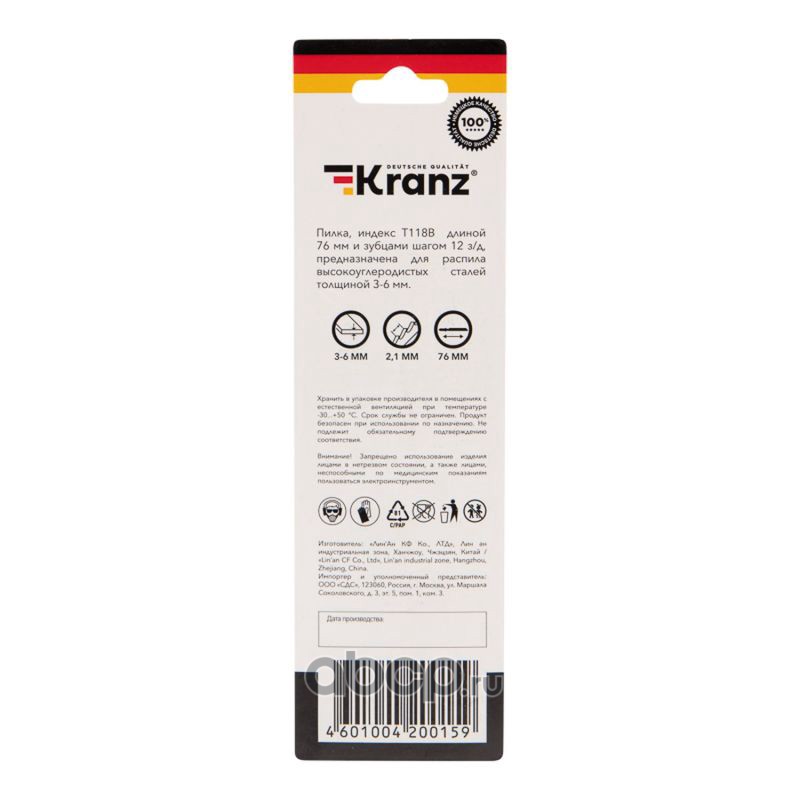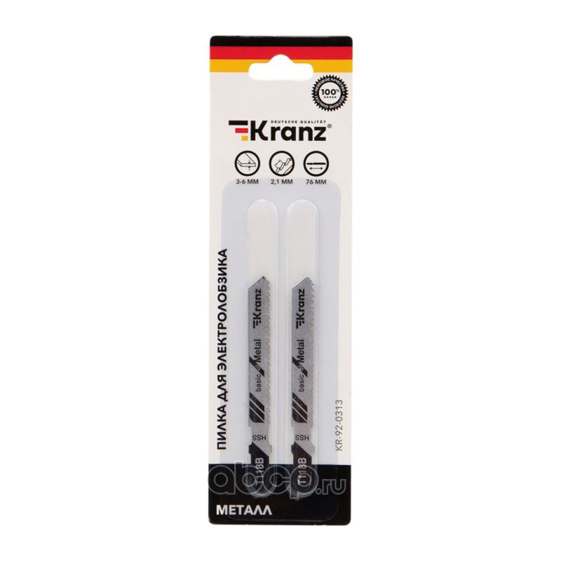 Пилка для электролобзика по металлу T118B 76 мм 12 зубьев на дюйм 3-6 мм (2 шт./уп.) Kranz